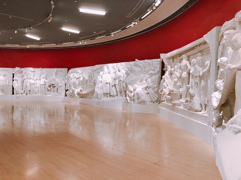六件高2.55米、總長(zhǎng)45米的“烽火藝程”主題浮雕所刻畫(huà)的正是國(guó)立藝專(zhuān)師生們譜就的西遷歷史圖景。刀石鑿撞的力度所營(yíng)造的紀(jì)念碑式的宏大與厚重,才足以匹配這段腹地長(zhǎng)征的波瀾壯闊。
