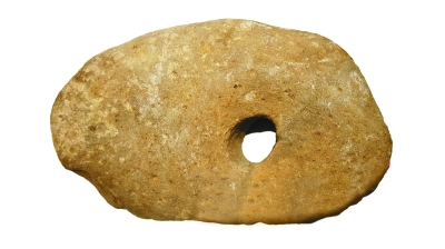 2015年7月7日,張福有與池南區(qū)區(qū)委書記曹樹清、科員于建一起,在區(qū)委所在地?fù)崴煽h漫江鎮(zhèn)漫江村進(jìn)行田野調(diào)查。于建看到一塊帶孔的石頭,拿給張福有看?!拔医舆^來一看,馬上看出這個(gè)孔肯定是人工磨出來的??椎闹苓吋s有1厘米向下磨了,凹了下去,而且兩面都有,這是典型的人為痕跡。可惜少了一個(gè)角,這個(gè)孔應(yīng)該能環(huán)上,缺的部分非常重要,必須馬上找到!”張福有對記者說,“于是,我們馬上開始尋找丟失的另一小半?!?/p>
