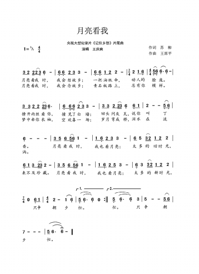 中央電視臺(tái)大型紀(jì)錄片《記住鄉(xiāng)愁》第三季片尾曲《月亮看我》的詞作者蘇柳得知自己要寫一首關(guān)于鄉(xiāng)愁的歌曲的歌詞時(shí),下筆前思考良久,終于在自己生日的那個(gè)凌晨,那道心中的月光仿佛照向了思鄉(xiāng)的自己,隨即落筆寫下:“月亮看我”。她想,古人思鄉(xiāng)時(shí)皆是舉頭望月,我偏要讓月亮來(lái)看我,豈不是古今中外獨(dú)一份了。