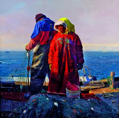 青年畫家田野創(chuàng)作的工筆重彩《中國紅》,表現(xiàn)了工人懸掛在高空中進(jìn)行粉刷作業(yè)的場景,揮舞的刷子左右搖擺,游刃有余,顯示出勞動(dòng)者嫻熟的技術(shù)。主體人物濃重的黑色配合背景的礦物朱砂色,強(qiáng)烈的黑白紅對比關(guān)系給人以震撼的視覺效果。田野說,當(dāng)時(shí)他看到粉刷建筑外墻的工人,身上的衣服被飛濺的油漆染成畫面般的效果,工人們認(rèn)真的勞動(dòng)精神打動(dòng)了他,勾起了其強(qiáng)烈的創(chuàng)作激情,他通過速寫、草圖、圖片等綜合方式收集了大量素材,最終創(chuàng)作出了這樣一幅具有時(shí)代特色的重彩作品,體現(xiàn)了新時(shí)代勞動(dòng)人民的生產(chǎn)熱情。王海濱、王瑛合作繪制的工筆畫《桑葚》,表現(xiàn)的是維吾爾族婦女的勞動(dòng)場面。畫家將主要人物安排在黃金分割線附近,與底部的木桌呈現(xiàn)出三角形態(tài)勢,偏仰視的角度體現(xiàn)了勞動(dòng)人民的崇高。為了突出畫面光感,畫家主動(dòng)將人物處理成厚重、深沉的逆光效果,背景運(yùn)用了濃重的蛤粉,將人物以及道具的外部輪廓完整地襯托出來。由于逆光具有平面性特點(diǎn),這進(jìn)一步提供了造型語言與中國畫平面性審美特征的視覺因素,強(qiáng)烈的明暗對比既體現(xiàn)了新疆地區(qū)的光照特征,同時(shí)又象征了勞動(dòng)人民光明美好的內(nèi)心世界。趙健創(chuàng)作的油畫作品《故鄉(xiāng)》則使用了“紀(jì)念碑式”經(jīng)典構(gòu)圖,畫面主體是一對勞動(dòng)中的漁民,夫妻相背而立,猶如“英雄”一般佇立在漁船上,畫家通過藝術(shù)加工賦予了作品含蓄的詩性。