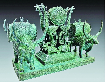 在展廳中央,一件青銅作品《歡樂鼓》引來(lái)不少觀眾駐足觀看?!稓g樂鼓》由貴州布依族工藝美術(shù)大師劉雍創(chuàng)作,由一個(gè)主鼓和兩個(gè)副鼓組合而成,主鼓懸掛在由四只鳳凰和四只龍頭龜構(gòu)成的鼓架上,鼓的正面鐫刻著貴州的象征——黃果樹瀑布,鼓的背面是傳統(tǒng)的銅鼓圖案,鼓身上遍布著日、月、魚、龍等吉祥紋樣;鼓的周邊布滿了芒刺,借鑒于布依族傳統(tǒng)的主打樂器——刺鼓。兩個(gè)副鼓分別由兩只雙頭牛馱負(fù),鼓和牛全身遍布著貴州特有的傳統(tǒng)民族圖案,強(qiáng)化了作品的民族特色。