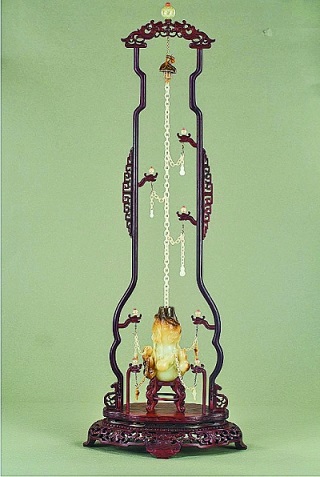 有著幾十年治玉經(jīng)歷的中國(guó)工藝美術(shù)大師楊根連,歷時(shí)多年的研究整理研究,終于在2003年拯救性地恢復(fù)了曾兩度失傳的金鑲玉工藝。由楊根連恢復(fù)并創(chuàng)新的金鑲玉工藝,一改舊時(shí)黏合鑲嵌的做法,僅靠金玉兩種材質(zhì)間不同的質(zhì)地結(jié)合起來(lái),通體無(wú)膠,其工藝特點(diǎn)是玉面平整溫潤(rùn),金絲與玉完美結(jié)合,沒有凹凸感,形成金玉交輝的工藝佳品。