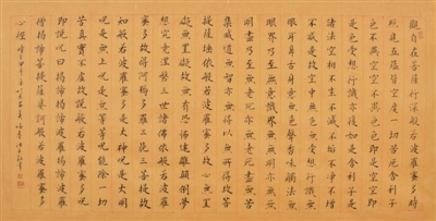 楷書,《辭?!方忉尀椤靶误w方正,筆畫平直,可作楷?!?。作為書法五體之中最為端正的一類,楷書創(chuàng)作尤其需要精氣之集中,心態(tài)之虔誠。在當(dāng)下能保持如此純粹心境的書家尤為難得。