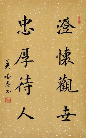 對待傳統(tǒng)楷書,吳福春有著豐富的經(jīng)驗和純正的承傳,他始終崇奉一個看似笨拙而原始的習(xí)書辦法——苦練。出笨力氣,下苦功夫。一個“觀海聽濤”,他可以不厭其煩寫上千遍。有時寫字入神,動不動就練到深夜。這樣嚴(yán)謹?shù)臑闀鴳B(tài)度,成就了吳福春中正妍美、浩氣堅質(zhì)、雄健有力的藝術(shù)風(fēng)骨。有人形容他的作品“于老辣中見骨力,于自如中見俊秀,于童心質(zhì)樸中見飄逸,其風(fēng)格奇而不詭,美而不媚,整體諧和,妙趣橫生,整體感覺率真、隨意、干凈、利索、妥貼、自然”。