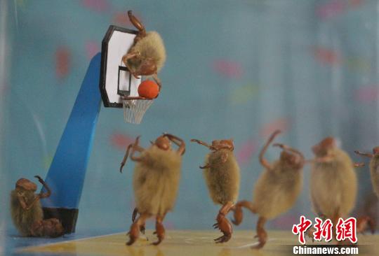 濟(jì)南市毛猴非遺傳承人楊鳳巖塑造毛猴“七十二變”的形態(tài),圖為楊鳳巖創(chuàng)作的“毛猴打籃球”?!≮w曉 攝