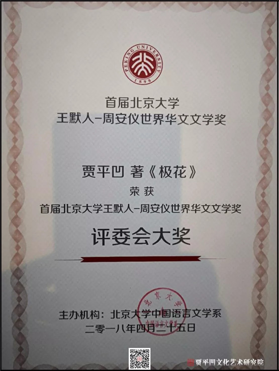 賈平凹長(zhǎng)篇小說《極花》榮獲首屆“北京大學(xué)王默人-周安儀世界華文文學(xué)獎(jiǎng)”評(píng)委會(huì)大獎(jiǎng)