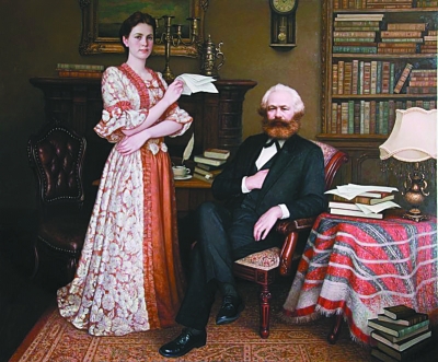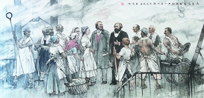 “馬克思題材繪畫作品創(chuàng)作”是美術(shù)界為紀(jì)念馬克思誕辰200周年而推出的一項(xiàng)重量級(jí)獻(xiàn)禮活動(dòng)。此項(xiàng)活動(dòng)由中央編譯局、中國(guó)文聯(lián)主辦,中宣部理論局和文藝局參與,中國(guó)美協(xié)承辦。活動(dòng)圍繞馬克思生平的重大歷史事件和重要人生節(jié)點(diǎn),請(qǐng)各地美術(shù)家以油畫和國(guó)畫為表現(xiàn)形式創(chuàng)作了24幅馬克思題材作品。在今年年初舉行的“馬克思題材繪畫作品創(chuàng)作工作會(huì)”上,中央編譯局的專家和北京大學(xué)、南京大學(xué)的教授也參與其中。在創(chuàng)作過程中,中國(guó)文聯(lián)、中國(guó)美協(xié)的領(lǐng)導(dǎo)和馬克思研究專家還走進(jìn)部分美術(shù)家的工作室進(jìn)行觀摩指導(dǎo)。根據(jù)中國(guó)美協(xié)提供的作品名錄來看,從《馬克思童年時(shí)代的特里爾城》到《寫作〈共產(chǎn)黨宣言〉》,從《在倫敦德意志工人教育協(xié)會(huì)作報(bào)告》到《〈資本論〉在工人之間傳播》,從《在國(guó)際工人協(xié)會(huì)(第一國(guó)際)成立大會(huì)上》到《滿腔熱情支持巴黎公社》,從《晚年關(guān)注俄國(guó)和東方經(jīng)濟(jì)落后國(guó)家的發(fā)展道路》到《延安時(shí)期學(xué)習(xí)馬克思主義蔚然成風(fēng)》,24幅作品基本上按照時(shí)間脈絡(luò)排列,其中群像型作品占比較大。馮遠(yuǎn)的中國(guó)畫《在國(guó)際工人協(xié)會(huì)成立大會(huì)上》呈現(xiàn)出一種蒸騰的動(dòng)感,現(xiàn)場(chǎng)氣氛令人激動(dòng),工人們將帽子拋向了空中,這是一種多少文字也寫不出的熱烈場(chǎng)面,讓人真正感受到了美術(shù)的力量。劉大為的中國(guó)畫《馬克思、恩格斯與工人代表們?cè)谝黄稹访枥L了馬克思、恩格斯到工廠考察調(diào)研的情景,領(lǐng)袖和工人打成一片,讓人讀出了思想與勞動(dòng)結(jié)合在一起的神圣。蘇州科技大學(xué)傳媒與視覺藝術(shù)學(xué)院的王嫩教授是江蘇唯一受邀參加“馬克思題材繪畫作品創(chuàng)作”的藝術(shù)家,因而受到了當(dāng)?shù)匦侣劽襟w的廣泛關(guān)注。據(jù)《姑蘇晚報(bào)》等媒體報(bào)道,今年1月5日,王嫩受邀赴京選定題目《終身伴侶》,回蘇州后一個(gè)月閉門創(chuàng)作初稿,2月5日再赴京接受中央編譯局專家審稿“挑刺”,通過審核后即趕回蘇州加班加點(diǎn),連大年初一都在進(jìn)行創(chuàng)作。上個(gè)月中央電視臺(tái)《不朽的馬克思》專題片攝制組曾前往蘇州王嫩工作室進(jìn)行現(xiàn)場(chǎng)采訪,北京電視臺(tái)亦專程赴蘇跟蹤拍攝創(chuàng)作進(jìn)程。