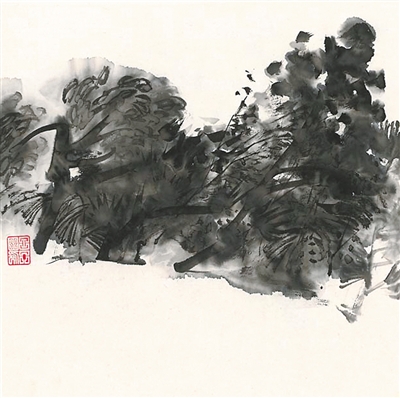 呂品田的水墨山水布局用心而不刻意,筆墨有成法而不拘泥,最能體現(xiàn)“乘物游心”的初衷。他以山川草木入畫,中鋒勾勒樹木草葉,側(cè)鋒排掃山石峰巒,輔以溫潤清透的潑墨,任水墨在紙上自然洇滲,形成筆形墨跡渾然交融的天成般的機趣與韻致。在他的畫上,墨跡與水痕相互映襯,燥潤適宜,剛?cè)嵯酀?。包括用以表現(xiàn)山石的自謂“斫木皴”,那頗具個性的筆法,不取巧、不藻飾,坦蕩大方,顯示了不同于傳統(tǒng)山水畫筆墨程式的獨特性。