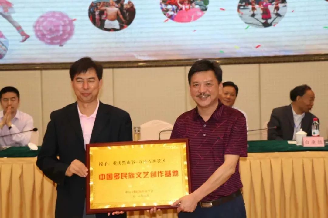 論壇現(xiàn)場,白庚勝代表“一帶一路”中國文化教育與國際交流基金授予重慶黑山谷·龍鱗石海景區(qū)“中國文化與國際交流基地”稱號,趙晏彪代表中國少數(shù)民族作家學會授予重慶黑山谷·龍鱗石海景區(qū)“中國多民族文藝創(chuàng)作基地”稱號。