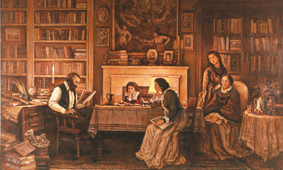中央美術(shù)學(xué)院教授孫景波已經(jīng)74歲,是參與創(chuàng)作的畫家中最年長的。他說:“我們這代人是在馬克思主義的信仰下成長起來的。馬克思主義解放全人類,改造舊世界,建立世界大同的革命理想,是我所信仰和追求的。我年輕時讀馬克思傳記,了解到馬克思為實現(xiàn)推動人類進步孜孜以求的精神和馬克思家庭濃郁的親情人文氛圍。對此有著深厚的情結(jié)。因此這次創(chuàng)作,我主動選擇畫馬克思一家人在書房里朗讀莎士比亞詩歌的場景,表現(xiàn)馬克思作為學(xué)者、詩人、丈夫、父親的一面?!睂O景波的這幅《革命的一家人》,采用電燈發(fā)明之前、燭光的用光,充滿明暗虛實的神秘感和親情的溫馨,襯托出一個書香家庭詩的意境。場景選擇的時間節(jié)點是1865年,馬克思、夫人、長女、二女兒和幼女全家相聚的時刻。