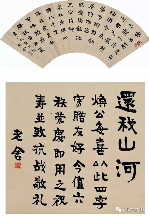 其三,雅致。書法基本是高雅文化,對(duì)文人雅士而言,其書寫行為本身就透露著雅致的人文氣質(zhì),是他們骨子里的東西。作為“人民藝術(shù)家”的老舍,崇尚雅俗共賞、由俗向雅。其書法手稿自然而然透露著他的這種雅致的文人氣質(zhì)。 老舍文學(xué)創(chuàng)作手稿作為存世的復(fù)合文本,堪稱高雅文化的瑰寶,原本是其“文學(xué)生產(chǎn)”過程中的最初成品,只是提供給編輯審看的文稿,并不直接進(jìn)入傳播渠道。而他那些存世的書法對(duì)聯(lián)、扇面,有意識(shí)創(chuàng)作的橫幅、條幅書作,還有因雅興因情感而為的詩稿、書信,基本都是沉穩(wěn)的楷書形式,雅意盎然。其中,他常用自作詩詞的書法作品饋贈(zèng)友人,尤其是他和身為畫家的夫人胡絜青合作的書畫作品,更為友人所珍視。這類適用于文人雅士交往的書畫作品,既體現(xiàn)了對(duì)傳統(tǒng)高雅文化的繼承,也顯現(xiàn)了現(xiàn)代文人的情趣和志向。就老舍書法而言,確實(shí)功底頗深,多體雜糅,古拙質(zhì)樸,別具風(fēng)貌,其筆法明顯帶有北碑意趣,線條堅(jiān)韌凝重,結(jié)構(gòu)內(nèi)斂緊湊, 用筆張弛有度,且時(shí)或兼容漢隸及金農(nóng)漆書筆意,墨象高雅,氣質(zhì)不俗,能夠給人留下深切而又鮮明的印象。