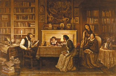孫景波的《革命的一家人》描繪了一個(gè)安詳寧?kù)o的夜晚,燭光下、壁爐前,馬克思的家庭詩(shī)歌朗誦會(huì)正在進(jìn)行。這是一個(gè)享受莎士比亞詩(shī)意的美好夜晚:二女兒勞拉依偎在母親燕妮身旁,大女兒小燕妮坐在桌前出神地凝視著父親的表情,不滿(mǎn)八歲的小女兒艾琳娜,看著爸爸動(dòng)情的樣子,眼神里充滿(mǎn)喜悅和好奇。此刻,馬克思自己也沉浸在詩(shī)意之中,他的手指伴隨著朗讀的節(jié)奏,下意識(shí)地在坐椅的扶手上敲打著節(jié)拍。馬克思的家庭,是一個(gè)令人敬慕的、偉大的革命家庭。他的妻子燕妮,不僅是他生活、生命中親密的終身伴侶,而且是他思想的、革命事業(yè)的堅(jiān)定不移的同志和戰(zhàn)友。燕妮和馬克思的三個(gè)女兒,在他的影響下,也都先后成為馬克思思想的繼承人和無(wú)產(chǎn)階級(jí)革命事業(yè)的杰出戰(zhàn)士。