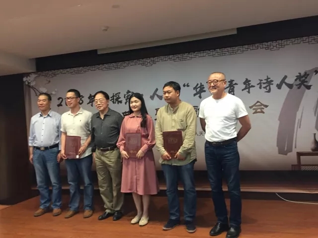 2018年華文青年詩人獎的評委鄒進(jìn)、吳思敬、牛慶國為三位獲獎詩人頒發(fā)證書