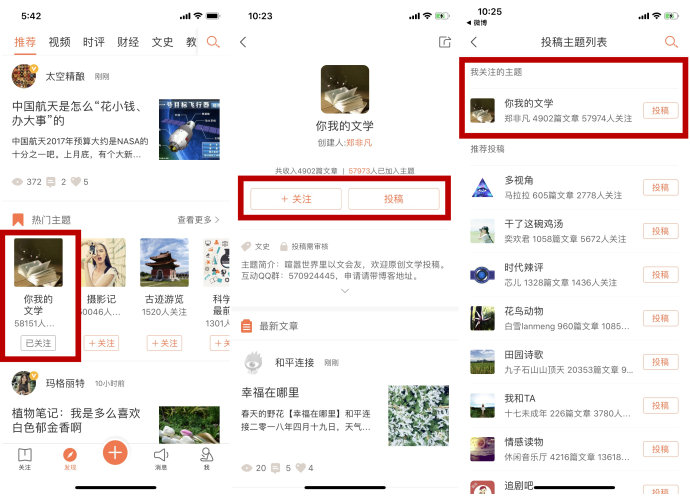 (1)在app發(fā)現(xiàn)頁(yè)熱門(mén)主題欄找到【你我的文學(xué)】主題關(guān)注。(如圖一)