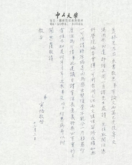 信中所提“科學(xué)院編委會”,“科學(xué)院”為“中國科學(xué)院”,成立于一九四九年,首任院長為郭沫若。“編委會”當(dāng)是《歷史研究》這一期刊的編輯委員會。一九五三年九月二十一日,中共中央組建的歷史問題研究委員會召開了第一次會議,其間,中宣部提議成立三個歷史研究所,陳寅恪為中古史所長的最有力人選。此外,會議的另一任務(wù)是出版一份史學(xué)界的刊物。十月七日,郭沫若電函陳寅恪,聘請他擔(dān)任中古史所長,并為次年正式刊行的《歷史研究》創(chuàng)刊號向他征稿。陳寅恪復(fù)電推辭了所長一職。(卞僧慧《陳寅恪先生年譜長編》,中華書局,2010年,280—281頁)出人意料的是,陳寅恪此前的得意門生汪篯在十一月執(zhí)郭沫若信,親自南下嶺南,力勸其北上就職。師徒的談話最終不歡而散,陳寅恪對此的態(tài)度集中體現(xiàn)在十二月一日由其本人口述、汪篯筆錄的《對科學(xué)院的答復(fù)》一文中。不過,關(guān)于《歷史研究》組稿一事,陳寅恪并未拒絕。后來正式公布的《歷史研究》第一屆編委的十八人名單中,陳寅恪、湯用彤、向達(dá)、季羨林皆赫然在列(蓋志芳《〈歷史研究〉(1954—1966)編委遴選及變動原因分析》,《東岳論叢》2010年第1期)。可以肯定的是,此前不久歷史所已與他們協(xié)商過進(jìn)入《歷史研究》編委之事,并告知了其他被選人員的答復(fù)?;蛟S此時已同意受聘為《歷史研究》編委的季羨林在致陳寅恪的信中亦傳達(dá)了約稿之意,所以,在十二月三日陳寅恪給季羨林的回信中,首先提及“兩篇論文”之事。一方面,因這兩篇文章之前曾寄給好友湯用彤和向達(dá),此二人與季羨林皆在《歷史研究》編委內(nèi),故后者正可順便取閱,以備評審刊用事宜;另一方面,給季羨林的這一回信亦間接答復(fù)了郭沫若此前的稿約。從《對科學(xué)院的答復(fù)》中,不難看出陳寅恪對“時尚”與“新學(xué)”積怨之深(陸鍵東《陳寅恪的最后二十年》,111頁),而在當(dāng)時的歷史學(xué)界內(nèi)引領(lǐng)時尚與“新學(xué)”的代表人物,無疑非郭沫若莫屬。因此,在經(jīng)歷了與學(xué)生汪篯的不愉快的談話后,不回復(fù)或間接回復(fù)郭沫若《歷史研究》約稿一事,應(yīng)是陳寅恪比較妥帖的處理方式,而此信之回復(fù)正可“一舉兩得”。
