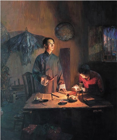 在畫面藝術(shù)表現(xiàn)上,張峻明采用了現(xiàn)實(shí)主義加浪漫主義的表現(xiàn)方式。創(chuàng)作期間,張竣明聽取了中央編譯局、中國美協(xié)、中央美院專家的建議,最終確定了陳望道站姿,頭仰望窗外,喻意東方欲曉,母親給他送來粽子,撥動(dòng)火苗引喻薪火相傳,點(diǎn)亮信仰之火這一構(gòu)思。畫面構(gòu)思全部確定之后,就是起稿上畫布階段了,大的色彩關(guān)系一直在調(diào)整中被確定下來,細(xì)節(jié)問題逐個(gè)推敲解決。比如,陳望道的被子、枕巾等?!耙?yàn)椴穹坷飾l件特別艱苦,白天寫字用的桌子到晚上是睡覺的床,畫面中的細(xì)節(jié)都要考慮進(jìn)去?!弊鳛闅v史題材主題性創(chuàng)作,如何將作品歷史性和藝術(shù)性相統(tǒng)一,一直是張峻明努力的方向。畫《陳望道翻譯〈共產(chǎn)黨宣言〉》時(shí),張竣明最初選擇在書房,根據(jù)查閱大量的史料,他感覺“書房”出現(xiàn)與那時(shí)候的真實(shí)背景有些不太相符,因此改為了柴房。