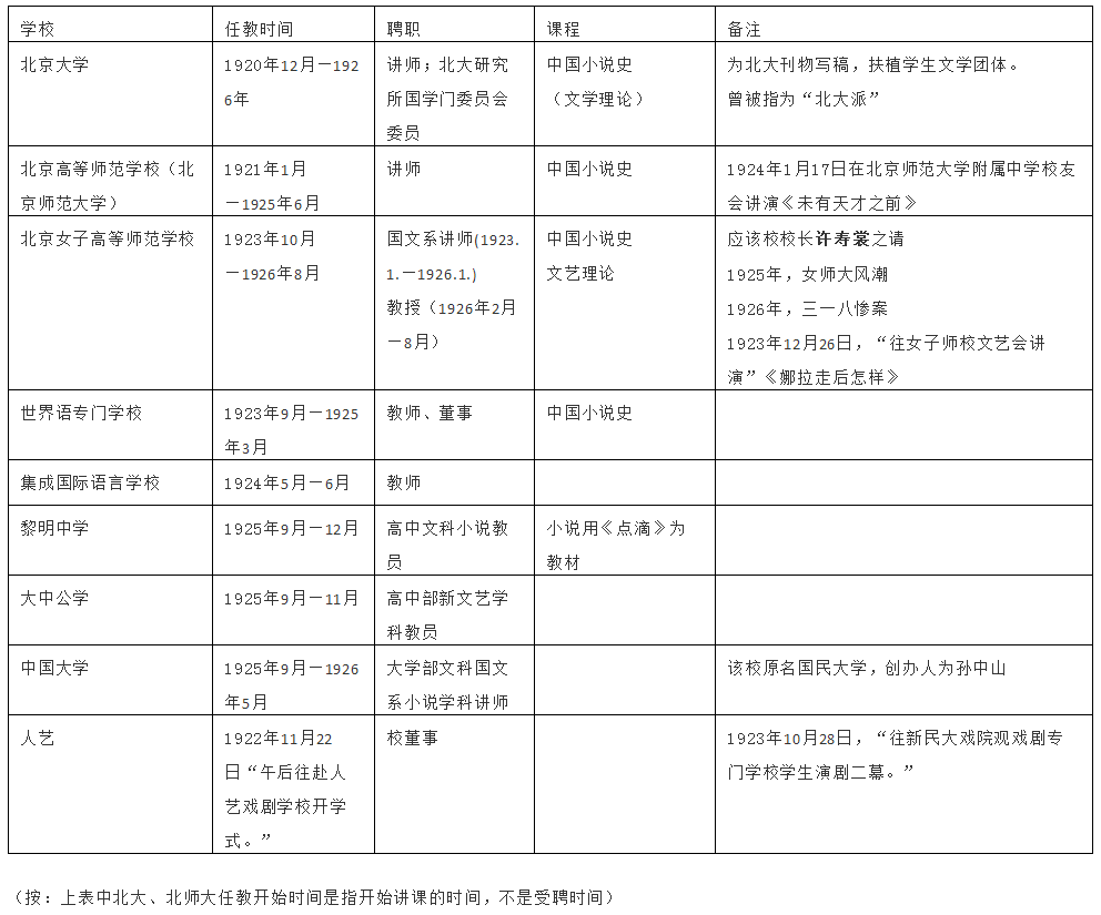 1920年8月,魯迅接受北京大學(xué)聘任,從12月開始,在北大講授“中國小說史”,自編講義《中國小說史略》,還曾翻譯廚川白村《苦悶的象征》作為教材講授文學(xué)理論,任教至1926年8月離京為止。魯迅在北京多所學(xué)校的任教情況參見下表: