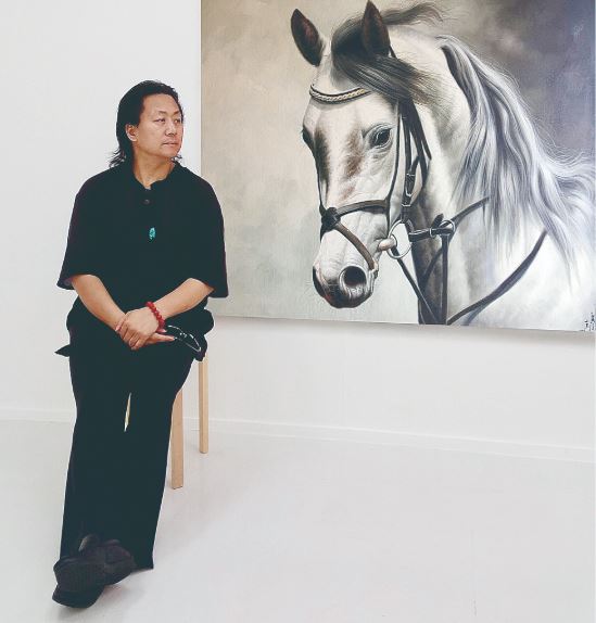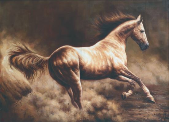 離開草原后,我投入到文學(xué)創(chuàng)作中,從《長江之歌》、中國共青團(tuán)團(tuán)歌《光榮啊,中國共青團(tuán)》到中國武警主題歌《忠誠衛(wèi)士之歌》,戎馬一生的我陰差陽錯地成為一名軍旅作家。歲月流逝,蟄伏于心中的駿馬情結(jié)卻依然濃烈。十多年前,我結(jié)識了青年畫家黃廣亮,他熱情、爽朗、謙遜的個性吸引了我,而他筆下的馬,更令我贊嘆不已。他畫的馬惟妙惟肖,無論奔馬、立馬、馬群都賦予了充沛的生命力。在廣亮的筆下,一匹匹駿馬奮鬃揚蹄,挾風(fēng)而進(jìn),在廣袤的土地上飛奔。有的騰空起飛,有的蹄下生煙,有的回首顧盼,有的長嘶吶喊,仿佛都要破紙而出。馬的眼睛閃閃發(fā)亮,無論你從哪個角度看,它的目光都好像在追隨著你,似有無限的眷戀之情;那挺拔的骨架像躍動的山峰,長長的鬃毛似緞帶凌風(fēng)狂舞,有力的脖子若龍頸屈伸,寬闊的胸膛肌肉抖動;凸起的血管青筋,你似乎能觸摸到那種血脈僨張的力量;鋼打鐵鑄般的四肢騰挪勁健獵獵生風(fēng),仿佛一旦踏上大地,就會擂響奮進(jìn)的戰(zhàn)鼓;張大的鼻孔有若噴筒,好像吹口氣,這些馬就能打著響鼻從畫布上跑下來……廣亮畫的馬,剛勁矯健、陽剛大氣激蕩其中,揮灑著北方人豪爽豁達(dá)、抱志不屈的天性,溶鑄成了自由奔放、宏偉壯闊、縱橫豪邁的藝術(shù)風(fēng)貌和大美境界。