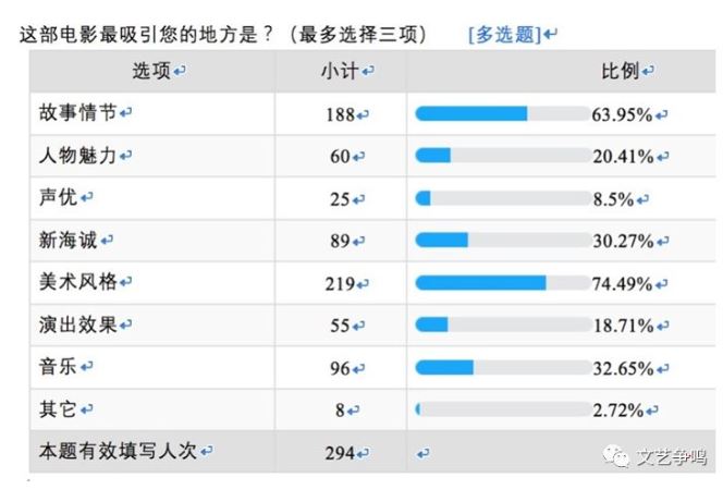 接受調(diào)研的人群的審美傾向可以顯示這部電影有趣的一個(gè)層面:它以“普通電影”的身份進(jìn)入大陸電影消費(fèi)視野的,并非像此前的宮崎駿電影那樣,具有定向吸引觀眾的特色。如圖——