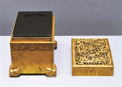 據(jù)了解,清宮用硯一般是由內(nèi)務(wù)府造辦處承辦制作,還有少量來自地方官員年例進(jìn)貢,或由地方織造按內(nèi)廷發(fā)樣承做。在硯的制作工藝上,清代宮廷御用硯不僅精于造型設(shè)計(jì),而且還注重裝飾工藝和題材,在造型、紋飾、雕刻等方面多有創(chuàng)新。一般是由內(nèi)廷如意館畫師畫樣,或遵照皇帝的旨意照硯樣成作。特別是康熙、雍正、乾隆三朝皇帝均參與過硯的設(shè)計(jì),而且各有所長。如雍正皇帝曾參與暖硯的設(shè)計(jì),并對暖硯進(jìn)行兩方面創(chuàng)新:一是命作銅爐式暖硯,并稱“硯即可熱,爐也可燒香”;二是新創(chuàng)用水屜溫硯的形式。此兩種形式的暖硯均有實(shí)物傳世,在此次展覽中也有展示。