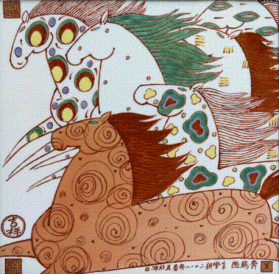 《奔馬圖》之二40x40紅綠彩瓷板畫2018