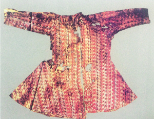 1959年,民豐縣尼雅夫妻合葬墓出土了東漢時期“萬世如意”漢字銘文錦袍。這件保存較為完好的錦袍,出土時色彩十分鮮艷。袍服身長122.5厘米,款式為“胡服”:直領、對襟、窄袖、緊腰、寬踞,其側加縫一塊三角衣料,增加了下擺的寬度。袍的領襟和下擺用繡有“延年益壽大宜子孫”的銘文錦制作。錦袍質(zhì)地厚實,以絳紫色為底,配有淡蘭、油綠、白色的茱萸紋和飄逸的云紋。