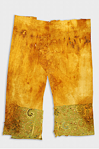 從出土的實物來看,當時精絕人的褲裝可分為筒褲和燈籠褲兩種形制。1959年,尼雅古墓出土一件東漢時期的男夾褲,用粗棉布作面,寬腰大襠,褲腿口與山普拉古墓出土的燈籠褲相比,顯得比較寬大。褲腿用草綠色細絹鑲綴,以綠地動物花草葉紋為主繡,草綠色細絹為底,配以絳紫、黃、寶藍、白等各色絲線,運用鎖繡法繡出卷草葉、豆英、金鐘華等紋樣,紋飾的枝蔓循環(huán)繁復,表現(xiàn)出漢代高超的織造工藝,同時顯示出漢代織錦“錦繡并用”的特征。