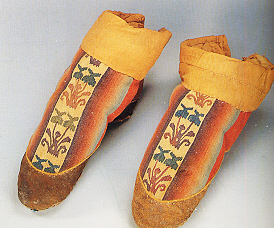靴子是西域居民的傳統(tǒng)衣式。1995年,尼雅1號墓地3號墓出土的一雙紅底暈裥緙花靴的樣式十分獨特。靴子長29厘米,高16.5厘米,用皮、絹、氈等多種材料縫制,靴面中央的白底上織并蒂花卉圖案,起到了錦上添花的裝飾效果。靴子構思巧妙,形制新穎獨特,是新疆古代鞋靴中的精品。
