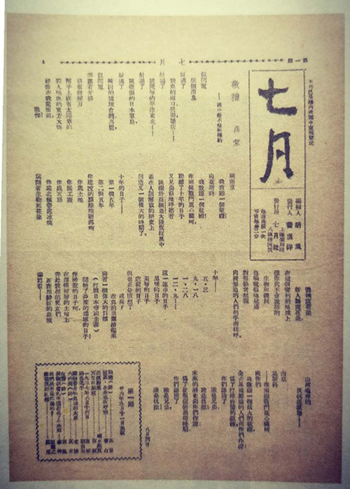 《七月》1937年9月11日創(chuàng)刊,周刊。胡風(fēng)編輯。七月社發(fā)行。出版地上海。出至第3期停1刊。同年10月16日在武漢復(fù)刊刊,改為半月刊,期號(hào)另起,上海雜志公司發(fā)行。次年再度???。1939年7月又在重慶復(fù)刊,改為月刊,華中圖書公司發(fā)行。1941年9月終刊。前后共出35期。
