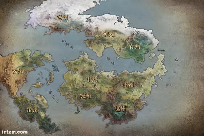 中州的都城位于大陸正中,交通便利,且處于盆地中央,易守難攻,歷代都是人族的權力中心。中州以南的宛州地勢平坦,物產(chǎn)豐富,加之偏安一隅,與相鄰各州有高山大澤為屏障,總能避開戰(zhàn)禍,因此成為商人云集的財富中心。瀚州草原與中州西北面隔海相望,游牧民族生產(chǎn)力落后,常為資源渡海劫掠。