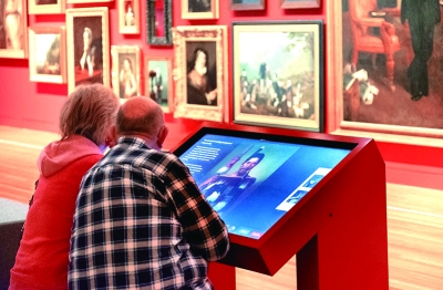 今年3月17日,經(jīng)過一年的籌備,新西蘭國立博物館新館的“Toi藝術(shù)”展覽與觀眾見面。展覽中,數(shù)字化導(dǎo)覽系統(tǒng)的引入獲得觀眾和媒體的一致好評。尤其是肖像畫展示單元,整面展覽墻上沒有一個標簽,采用全數(shù)字化導(dǎo)覽。數(shù)字顯示屏的主頁面依舊采用“自然映射”方式,按照展示墻的原貌還原畫作,為了突出尺寸較小、不易被觀眾注意到的畫作,工作人員設(shè)計了一個循環(huán)展示動畫頁面,突出每一幅畫作的細節(jié),并為每一幅畫作標注了一個只有一行字的小故事,讓觀眾不用與設(shè)備互動就可以了解畫作背后的故事。點擊進入后,一些更具體、深入的信息便會出現(xiàn),除了有關(guān)畫作的詳細介紹,觀眾還可以放大查看肖像細節(jié),將畫作翻轉(zhuǎn)到相反位置、查看畫作修復(fù)前后色彩的變化、使用專業(yè)成像技術(shù)查看不可見圖層……