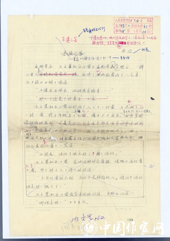 《不速之客》寫在16開的稿紙上,正文用深藍色鋼筆寫成,全文共計39個頁碼。在首頁的右上角蓋有人民文學雜志社的閱稿印章,顯示閱稿時間是1961年1月4日,這說明這一章節(jié)小說完稿的時間應該是在1961年以前,至于此時《山呼海嘯》的整部手稿是否完成,尚難斷定。小說正文上方顯示有兩個題目,一個是“來投之客”,另一個是“不速之客”,其中“來投之客”被幾道斜線劃掉了,是舍棄的意思。而“不速之客”則清晰地保留下來。在“不速之客”幾個字的旁邊還有一段紅色字體標記的備注:請考慮一下,哪個題目好些?“來投之客”似成語非成語,是否定性就用成語?這應是曲波在同編輯協(xié)商哪一個題目更好、更符合雜志社的要求,從小說內(nèi)容來看,“不速之客”顯然更符合小說的情節(jié),劉介山突然來投,算是“不速”之舉,但他的來投并不是真的歸順,只是敵人的又一個陰謀,所以,綜合來看,“不速之客”這個題目更切合內(nèi)容,而最后也確實采用了這個題目。正標題的下方還有一個副標題:長篇《山呼海嘯》中的一節(jié),這一副標題在1961年《人民文學》刊發(fā)時也予以保留,說明這份手稿是當時作者正在創(chuàng)作的長篇小說《山呼海嘯》中的一部分,是其中的一個獨立而完整的章節(jié)。但在1977年出版的《山呼海嘯》里,這一個章節(jié)并沒有被完整的保留下來,其情節(jié)被分散在另外的幾個章節(jié)里出現(xiàn)。