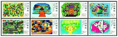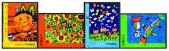 2009年6月1日,我國發(fā)行《祝福祖國》特種郵票,全套4枚,圖案分別為“我愛中華”“快樂生活”“熱愛和平”和“從小愛科學(xué)”。這套郵票通過少年兒童對自己美好生活的描繪,表現(xiàn)祖國六十年來的發(fā)展變化。經(jīng)專家評審,來至江蘇睢寧的4幅作品選為郵票圖案印制成郵票。4幅兒童畫的作者分別是宋志偉、劉茹、宋志威和孫鵬炎,年齡最小的只有6歲。