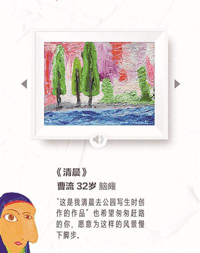 記者注意到,在“一元購(gòu)畫(huà)”公益活動(dòng)里,有兩幅32歲腦癱患者曹流的作品,一篇是《無(wú)?!?,畫(huà)的是一朵粉紅色的畫(huà),另一幅《清晨》是他清晨在公園的寫(xiě)生。