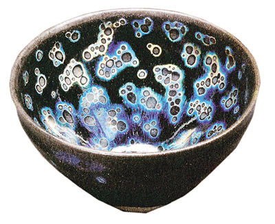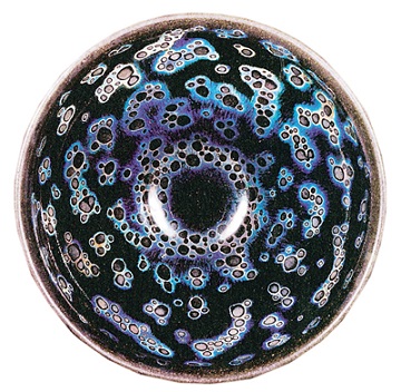 曜變天目盞在陶瓷界一直是傳說般的存在,它靜靜地陳列在東京靜嘉堂文庫,給予觀者的視角高度極佳,能夠剛剛好看到內(nèi)壁中的藍(lán)色窯變圓點。內(nèi)壁有2 / 3的面積曜變斑點比較集中,白色、紫色、藍(lán)色湊成了點點圓斑,釉水賦予的鮮明金光時隱時現(xiàn)。壓低手持望遠(yuǎn)鏡的視角,鏡頭變焦和對焦過程中,那藍(lán)色斑點和“五彩”炫光交織在一起。圍著天目盞轉(zhuǎn)著圈欣賞,隨著視線的移動,藍(lán)色圓斑的顏色會變幻不定,瑰麗奇詭得不像是人間之物,甚至透出一種“近乎妖”的感覺。那些藍(lán)色的曜變色彩很是沉穩(wěn),并不輕佻,像極了深夜晴空的星斗,這種體驗非常玄虛。這抹藍(lán)色閃著釉光,與黑瓷簡直是絕佳搭配,既顯出黑色的高級又突出藍(lán)色的高貴,可謂顏色審美中的罕見之作,難怪被人稱為“碗中宇宙” 。曜變,之所以難以復(fù)制和再現(xiàn),是因為團(tuán)團(tuán)簇簇的藍(lán)色圓斑實在是一場“星辰宇宙”般的意外,這種不可控才是它令人難忘的原因。