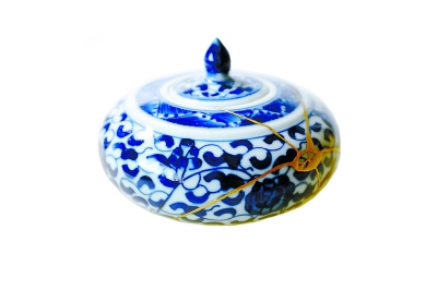 雖然中國掌握大漆修復(fù)技藝的歷史很早,在明代黃成所著的《髹飾錄》就有漆修古器的記載,但介紹的技法如“云綴”等語焉不詳,據(jù)王世襄先生考證也無法肯定。日本將中國陶瓷燒造技術(shù)、漆器制作技術(shù)引入后,逐步進(jìn)行了本土化改良。據(jù)傳在日本桃山時(shí)期就有了漆修陶瓷的技法,用大漆黏合補(bǔ)缺并施以金粉或金箔裝飾的手法,被稱為“金繕”,是非常受尊重的一種工藝技法。
