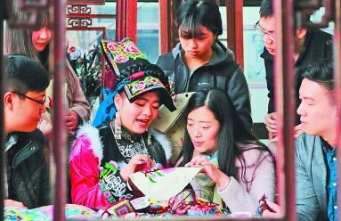 羌繡傳承人在向青年學(xué)生講解羌繡知識(shí) 光明圖片