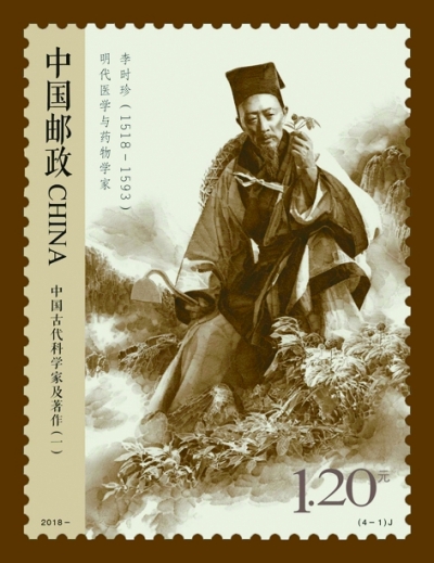 中國郵政5月26日發(fā)行《中國古代科學(xué)家及著作(一)》紀(jì)念郵票1套4枚,郵票圖案名稱分別為:“李時珍”“《本草綱目》”“宋應(yīng)星”“《天工開物》”,全套郵票面值4.80元。