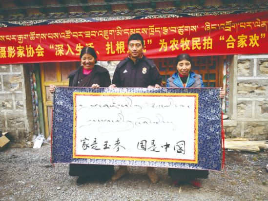 我們采風(fēng)團的藝術(shù)家們這次來是有任務(wù)的:攝影家現(xiàn)場給村民們拍攝打印全家福,書法家給村民們寫“福”字和對聯(lián)。村民們聽說了,都熱情地聚攏過來,彩色打印機前一點點被推出的照片,時時引起陣陣歡笑。這時卻發(fā)現(xiàn)央宗不在,說是一早就到山上趕牦牛去了。姐姐卓嘎特別請書法家寫了一幅總書記回信上“家是玉麥、國是中國”八個字的藏漢文作品。央宗回來看到也提出想要一幅,卻已經(jīng)沒有裱好的空白宣紙了。我們答應(yīng)央宗,回到拉薩就給她寫完寄過來——文藝家們也不想在這個充盈著幸福氛圍的地方留下任何遺憾。