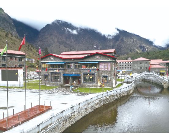 這里完全不像邊境鄉(xiāng)鎮(zhèn)的樣子!這是最初沖擊我的觀感。一條干凈的高標(biāo)準(zhǔn)水泥路沿著河谷直插下游,一幢幢風(fēng)格統(tǒng)一的門巴族特色小樓齊布在路邊,每一幢樓上都裝飾著一個藏族傳統(tǒng)的吉祥八寶圖案。樓和樓都是相似的布局,一層是農(nóng)家樂的餐館布局,二層是住宿區(qū)。據(jù)說,旅游已經(jīng)成了這個邊境鄉(xiāng)鎮(zhèn)的主要收入來源之一,而我們來之前的五一假期,這里的房間供不應(yīng)求。