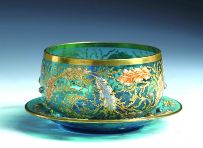 展品中,“透明黃色鍍金刻面玻璃畫(huà)琺瑯花卉紋瓶”以華麗的鍍金裝飾、絢麗繁復(fù)的釉彩繪畫(huà)和車(chē)刻工藝闡釋了19世紀(jì)波西米亞玻璃的精髓;產(chǎn)于20世紀(jì)早期的“白套藍(lán)鍍金玻璃畫(huà)琺瑯花卉紋瓶”,厚重的釉彩加之鍍金工藝使該玻璃器物的表面產(chǎn)生立體浮雕般的效果;“透明套紫車(chē)刻鍍金玻璃高腳杯”,在透明玻璃表面套色并進(jìn)行車(chē)刻后,再裝飾鍍金和描金圖案,體現(xiàn)了歐洲玻璃富麗華貴的風(fēng)格。