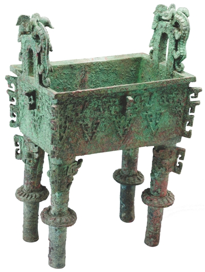 柱足上裝飾扉棱,柱足中部裝飾圓盤,在商周青銅器中獨(dú)一無二。歷史價(jià)值與藝術(shù)價(jià)值極高,堪稱國(guó)之瑰寶。