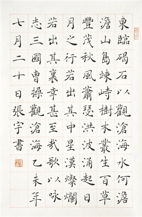 能夠把楷書寫好的人,也一定是個(gè)有溫度、有深度、有廣度的人,因?yàn)樗简?yàn)著一個(gè)人的定力和對書法藝術(shù)的理解。因此,在我看來,無論是為人處事還是為藝作文,張宇都足以成為楷則。