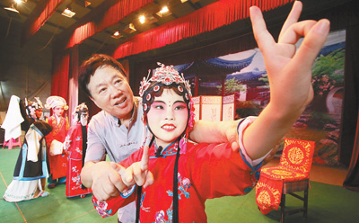 日前,在河北青縣木門店鎮(zhèn)扣莊村“哈哈腔”傳承示范基地,傳承人劉宗發(fā)(右二)正為排練中的小演員指點(diǎn)表演動(dòng)作。