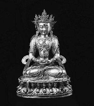 除此之外,一尊罕見漢藏宮廷風(fēng)格“十五世紀(jì) 銅鎏金嵌寶 無量壽佛”也吸引眾多藏家關(guān)注。無量壽佛是為明清兩代宮廷佛堂供奉的重點(diǎn)內(nèi)容,此尊無量壽佛面龐方圓,頭戴五葉花冠,頂結(jié)高發(fā)髻,耳側(cè)繒帶翻卷,耳垂圓形花珰。面容莊嚴(yán)肅穆,厚唇仍帶朱砂漆,眉心白毫鑲嵌寶石,寶石仍保存完好。本尊裝飾繁縟,工藝精細(xì),體量碩大,銅質(zhì)細(xì)密,雖然不帶刻款,但造型樣式、雕刻水平、鑄造工藝等與宮廷造像基本沒有區(qū)別,彰顯出明顯的皇家氣度。大量研究已經(jīng)表明,明代宮廷造像主要有兩種形式,分別代表兩種不同的用途:一種是刻有紀(jì)年銘文的形式,造像上刻有“大明永樂年施”或“大明宣德年施”的款識,主要用于賞賜西藏上層人士;另一種是無紀(jì)年銘文的形式,主要為宮廷佛堂或皇家寺廟供奉。此次亮相的這尊“銅鎏金嵌寶 無量壽佛”明代宮廷造像就是此種無紀(jì)年銘文的形式,它以完美的造型、精致的工藝充分顯示了它的高貴的出身——宮廷御用監(jiān)督造。