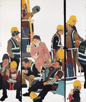 從參展作品中可以看出,青年美術(shù)家的創(chuàng)作主題很廣泛——工業(yè)、農(nóng)業(yè)、科技、軍事,以及新農(nóng)村建設(shè)等均有涉獵。比如張眾的中國畫《北京新機(jī)場(chǎng)·筑夢(mèng)英雄志》對(duì)建設(shè)者的歌頌,作者在傳統(tǒng)繪畫表現(xiàn)語言的基礎(chǔ)上大量借鑒雕塑手法,在空間與均衡、質(zhì)感與量感的對(duì)比中烘托出了筑夢(mèng)英雄的崇高之感。觀者還可以在沈曉明的中國畫《曦風(fēng)》中,看到消防官兵們?yōu)楸Wo(hù)國家人民的生命財(cái)產(chǎn)安全所做出的努力;在張靜的中國畫《中國速度》中,動(dòng)車組列車帶來的是作者對(duì)國家科技騰飛的禮贊。還有很多作品是青年美術(shù)家深入基層采風(fēng)所得,比如陳留的水彩粉畫《禮贊·大地》 、周濤的中國畫《婚禮》 、馬建茂的油畫《古鎮(zhèn)余暉》等,青年人走進(jìn)藏族聚居區(qū)、彝族聚居區(qū)等少數(shù)民族地區(qū)體會(huì)當(dāng)?shù)仫L(fēng)貌,走進(jìn)田間地頭體驗(yàn)農(nóng)桑,在他們的作品中都能看到青年人對(duì)現(xiàn)實(shí)的積極態(tài)度。