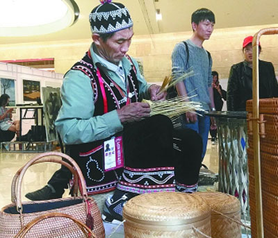 云南瀾滄非遺傳承人李扎而現(xiàn)場展示竹編技藝。張勇攝/光明圖片