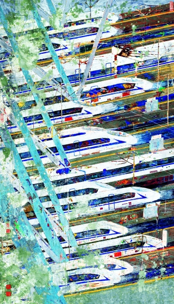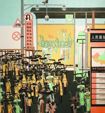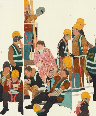在本屆全國青年美展上,關(guān)注現(xiàn)實(shí)、扎根生活的作品讓人耳目一新,印象深刻。張眾的中國畫《北京新機(jī)場·筑夢英雄志》歌頌了機(jī)場建設(shè)者們?yōu)閭ゴ髸r(shí)代添磚加瓦的勞動精神,婁敏的綜合材料作品《新時(shí)代的勞動者》表達(dá)了作者對新型勞動者的敬意,何永興的油畫《收獲者》、曹宏倫的油畫《漁獲夕陽》傳遞著豐收的喜悅,曹文惠的《女劍客》、陳林的《鋼與泥·格斗》等油畫作品塑造了中國軍人日常訓(xùn)練或執(zhí)行任務(wù)時(shí)的英武形象,曹雁楠的連環(huán)畫《逐夢長空》之一以飛機(jī)倒懸場景展現(xiàn)了空軍飛行員的藍(lán)天英姿,沈曉明的中國畫《曦風(fēng)》生動表現(xiàn)了消防官兵們?yōu)楸Wo(hù)人民生命財(cái)產(chǎn)安全所做出的努力。除了對國家建設(shè)者和保衛(wèi)者的謳歌,參展作品還以多種多樣的形式展現(xiàn)了新時(shí)代的中國風(fēng)貌,如張靜的中國畫《中國速度》以動車組列車表達(dá)了對國家科技騰飛的禮贊,張旭的油畫《筑夢曲·四》以斑駁的色彩營造出濃郁的工業(yè)氣息,盧妙玲的漆畫《平行的世界》用紛繁復(fù)雜的平行線條切割畫面,為觀者呈現(xiàn)了現(xiàn)代化城市建設(shè)的欣欣向榮。此外,蔡曉斌的油畫《南小河邊的秦腔》、馮瑜的油畫《喜訊》、蔣露的中國畫《地鐵九號線》、陳鵬的水彩粉畫《老有所樂》等作品展現(xiàn)了普通百姓的多彩生活。趙鴻賓的中國畫《金秋暖風(fēng)送祥音》、黃華斌的中國畫《春晨》、陳流的水彩畫《禮贊·大地》等作品則是祖國大好河山的生動寫照。