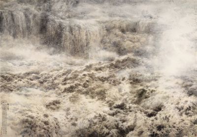 每一個(gè)草稿,都是向“完美”逼近的階梯。初稿之一“大塬靜涌遠(yuǎn)去”,于2013年9月在中國(guó)國(guó)家博物館草圖觀摩展中受到充分肯定,但宋雨桂深感還沒(méi)有畫(huà)出他心中的黃河,于是開(kāi)始重新思考。第二稿選擇“壺口”為節(jié)點(diǎn),更適于表現(xiàn)“黃河之水天上來(lái)”波瀾起伏、洶涌奔騰的氣勢(shì),彰顯其濤聲澎湃、川流不息的精神。這一設(shè)計(jì)稿于2014年6月完成,雖然同樣在草圖指導(dǎo)工作會(huì)上得到好評(píng),但宋雨桂依然在推敲如何更好地表現(xiàn)和處理水勢(shì),以使畫(huà)面呈現(xiàn)出一路挾雷裹電咆哮而來(lái)經(jīng)久不衰的黃河氣概。為突出“魂魄”,他再次否定了“深溝翻滾而下”常規(guī)的黃河瀑布表現(xiàn)形式。2015年完成的第三稿設(shè)計(jì),畫(huà)面構(gòu)圖大膽,摒棄石頭河岸等常規(guī)思維,用水的力量支撐黃河之水咆哮而來(lái)的氣勢(shì)。于是,鏗鏘有力、洶涌而下的黃河瀑布,成為畫(huà)面主體。急流忽上忽下、忽左忽右,暗喻畫(huà)面里藏著兩岸的山,水底的石托起黃河的驚濤駭浪,掀起萬(wàn)丈狂瀾。這更能體現(xiàn)黃河博大寬厚、柔中帶剛、勇往直前的精神。