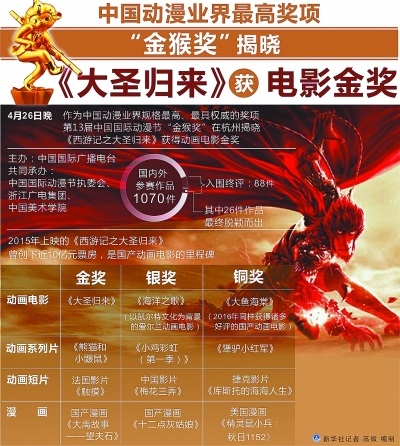 《大圣歸來》曾獲中國動漫業(yè)界最高獎項“金猴獎”電影金獎。新華社發(fā)
